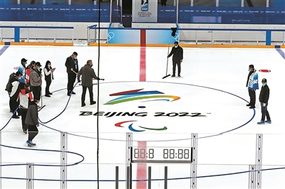 国家体育馆进入北京冬残奥会转换期,昨天,竞赛场馆制冰团队在冰面上完成了冬残奥会标识更换铺设工作。