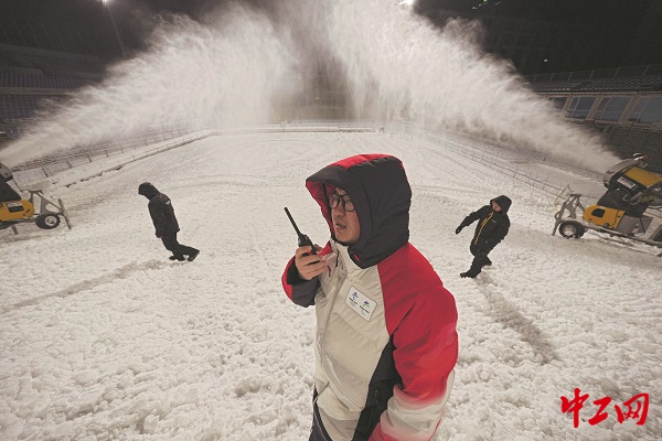 2021年12月18日晚11时,北京首钢滑雪大跳台,韩冬(图中)和工作人员正在查看造雪情况。与其他雪上场馆不同,首钢滑雪大跳台是北京冬奥唯一坐落在城区的雪上竞赛场馆。由于北京城区白天气温高、降温晚、寒潮短,只有在深夜至凌晨才能达到造雪的要求。