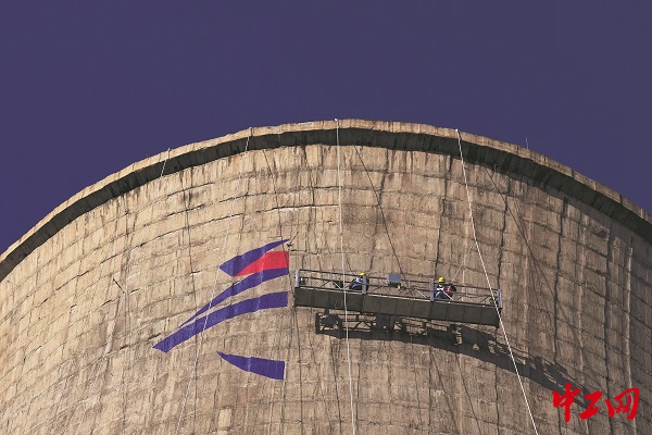 2021年12月30日,与北京首钢滑雪大跳台相邻的一个冷却塔上,工作人员正在粉刷北京冬奥会会徽。