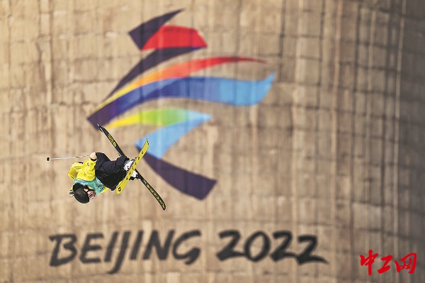 2022年2月9日,北京首钢滑雪大跳台,北京冬奥会自由式滑雪男子大跳台决赛上,一名选手高高跃起。
