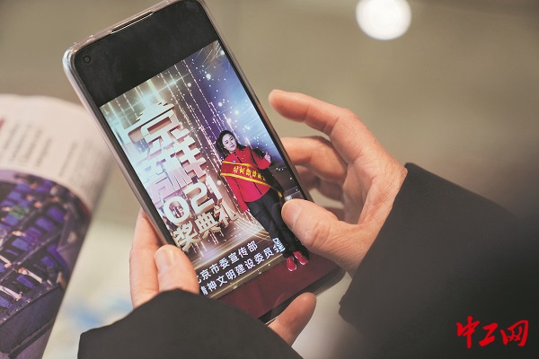 2021年12月17日,北京首钢园,姜金玉正在展示参与2021年“北京榜样”颁奖典礼时的照片。