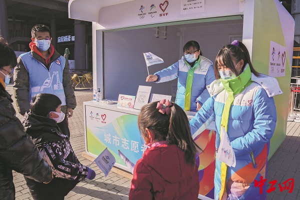 2021年12月19日,北京首钢园,来自首钢的志愿者正为来此游玩的市民发放冬奥主题小旗。