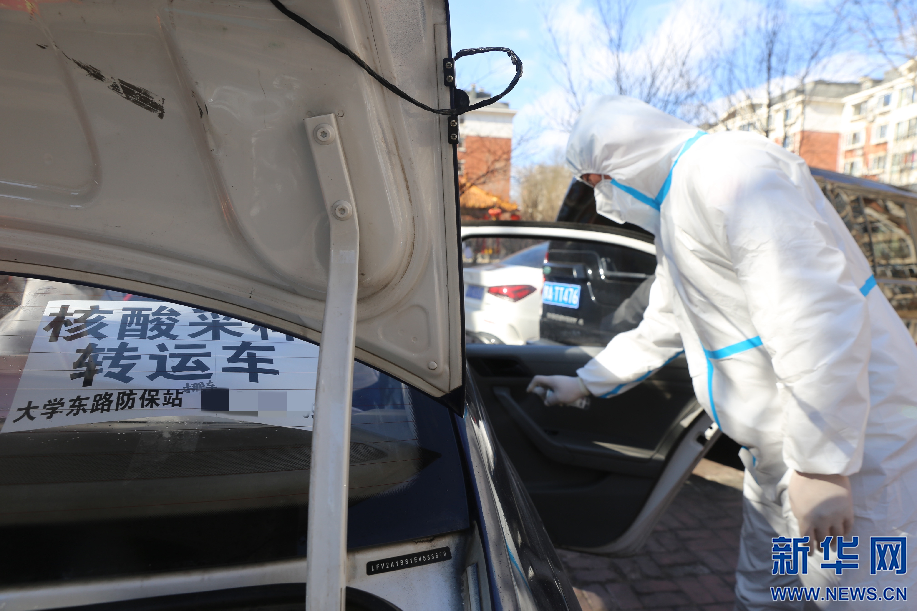 到达核酸采样点后,籍东斌在工作人员取样本间隙对车辆进行消杀。核酸样本转运存在着一定风险性,籍东斌说,只要按要求做好防护,按规定完成工作,就没什么问题。新华网 李倩摄