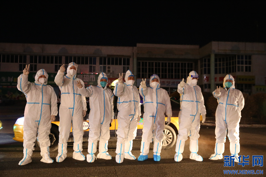 收工之前,现场部分志愿者司机们打出代表胜利的手势,希望疫情早日散去,青城重现活力。新华网 李倩摄