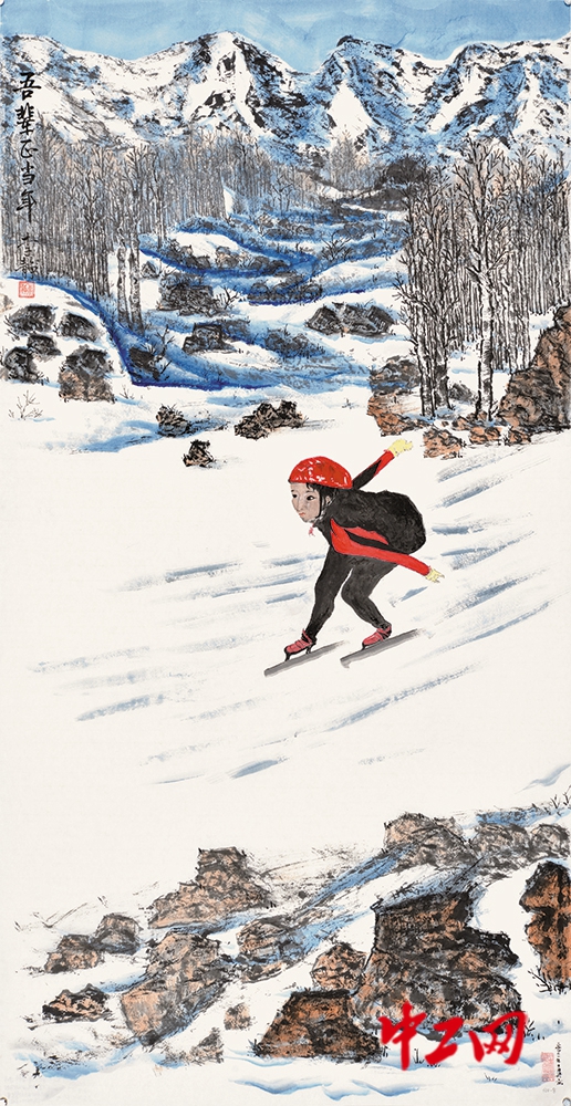 《吾辈正当年》(国画,尺寸68cm×138cm),作者李静,“冰雪情·冬奥梦”全国职工冰雪主题绘画活动优秀奖作品