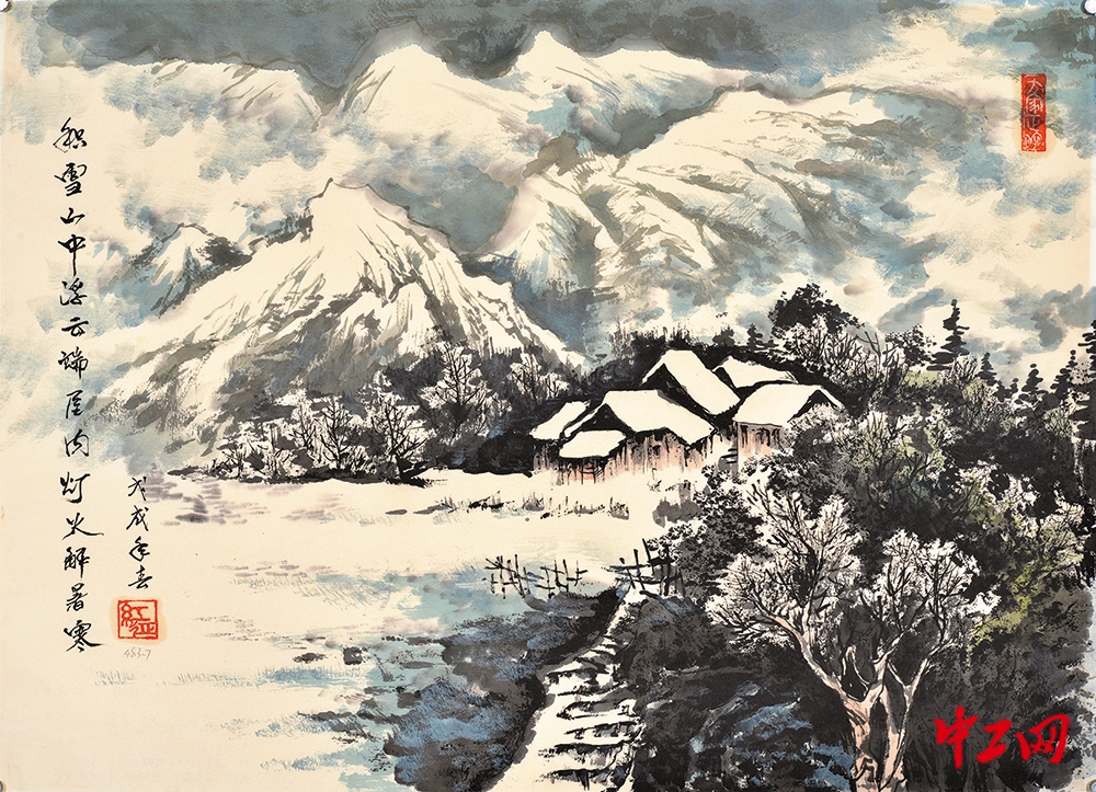《积雪山中浮云端 屋内灯火解暑寒》(国画,尺寸70cm×50cm),作者刘红征,“冰雪情·冬奥梦”全国职工冰雪主题绘画活动入围奖作品