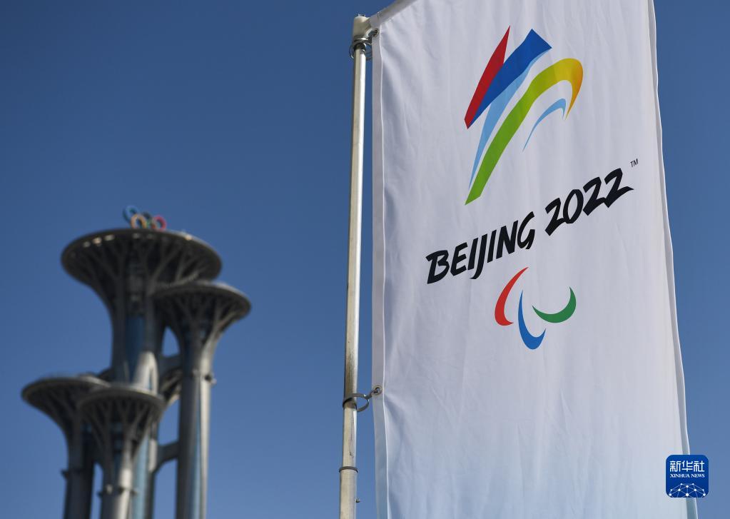 这是2月24日拍摄的主媒体中心外印有北京冬残奥会会徽的旗帜。