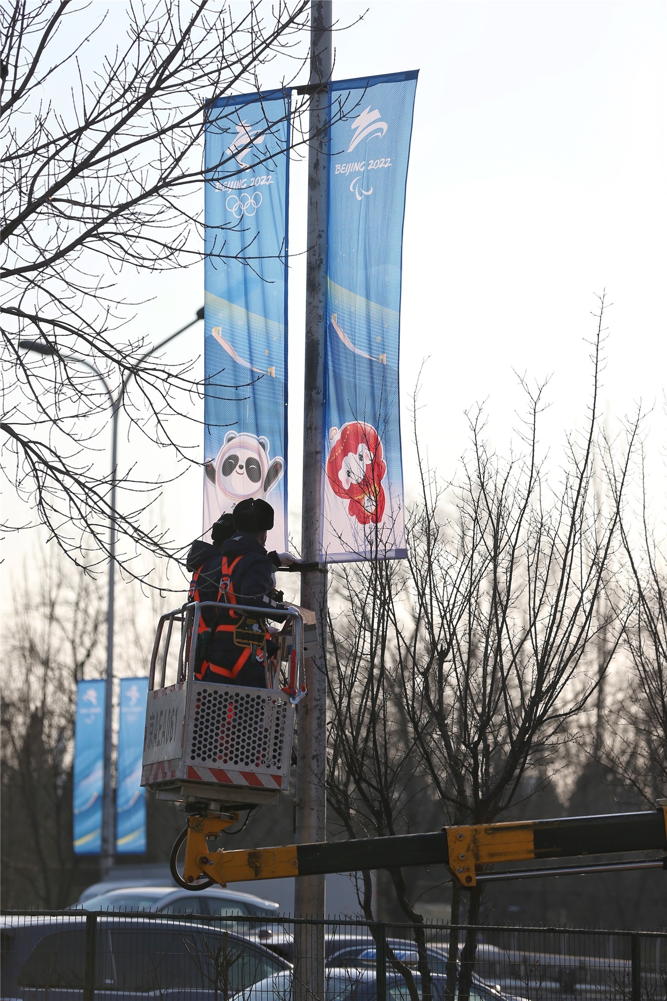 2月24日,北京北四环,工作人员摘下冬奥会的红色道旗,更换为冬残奥会使用的蓝色道旗。