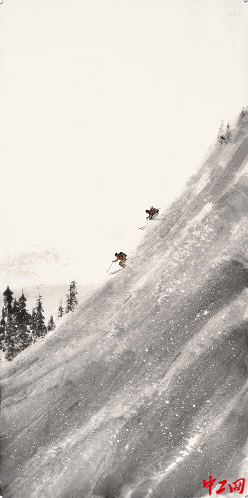 《冰雪缘》(国画,尺寸68cm×138cm),作者崔景余,“冰雪情·冬奥梦”全国职工冰雪主题绘画活动优秀奖作品