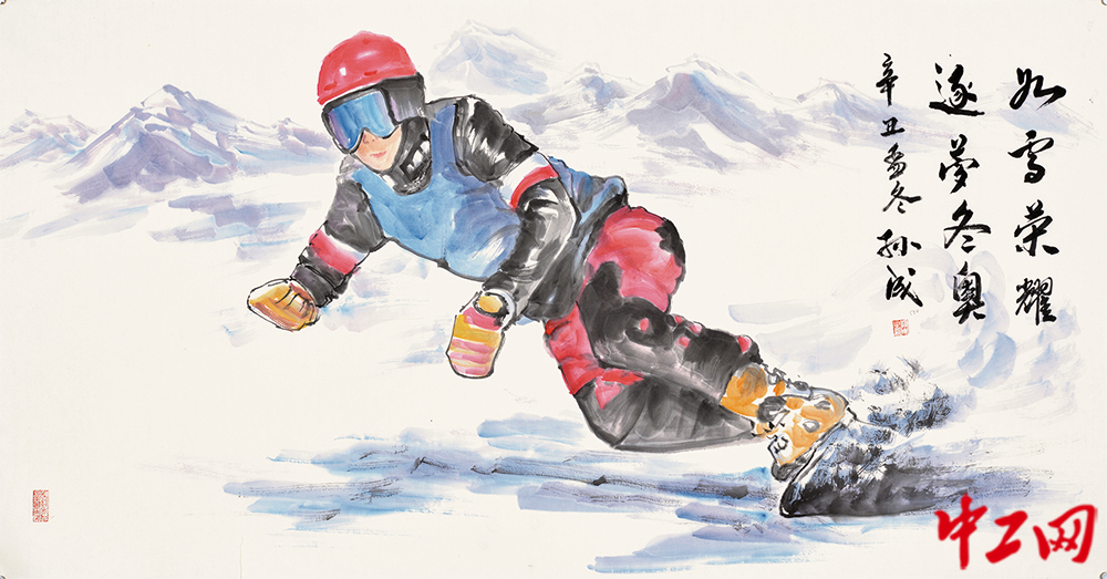 《冰雪荣耀 逐梦冬奥》(国画,尺寸138cm×39cm),作者孙成,“冰雪情·冬奥梦”全国职工冰雪主题绘画活动优秀奖作品