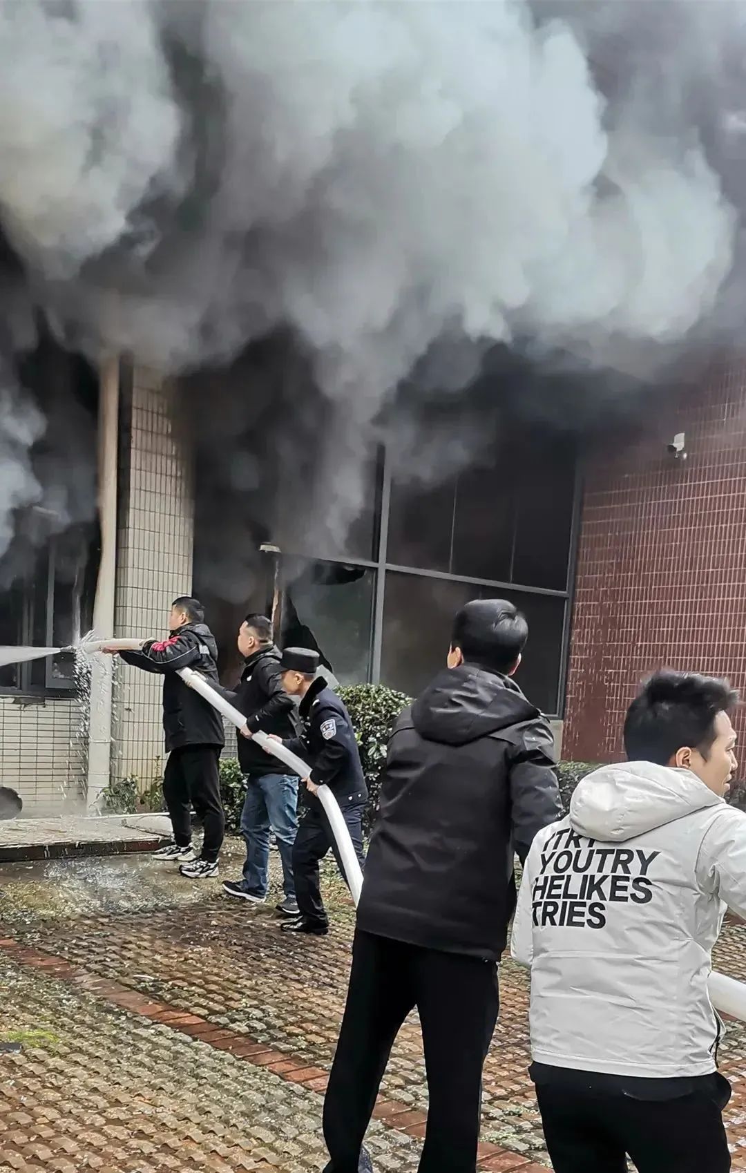 此时,玻璃已经烧得噼啪响,火势也已从室内通过窗户往外窜。黄波来不及多想,立即跑向隔壁单位询问消防栓位置,开水后便抱着消防水带向起火现场飞速跑去。为了让水能直接浇到火上,黄波一直尽可能拿着水带靠近火源,最近时,他距离明火仅1米左右距离。