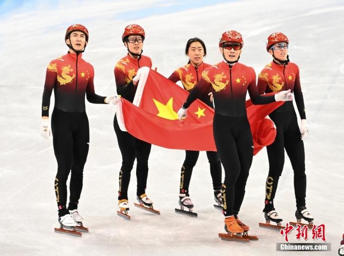 在2月5日晚结束的短道速滑混合团体接力决赛中,由武大靖、任子威、范可新、曲春雨组成的中国队率先冲过终点,为中国体育代表团拿到本届冬奥会首枚金牌。中新社记者 毛建军 摄