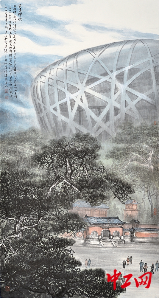 《双遗辉映》(国画,尺寸96cm×187cm),作者赵健东,“冰雪情·冬奥梦”全国职工冰雪主题绘画活动优秀奖作品
