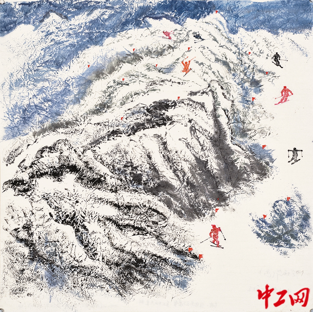《任他寒云万里雪 直上天山九重阙》(国画,尺寸68cm×68cm),作者皮振华,“冰雪情·冬奥梦”全国职工冰雪主题绘画活动优秀奖作品
