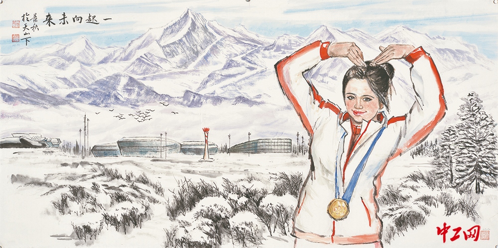 《一起向未来》(国画,尺寸138cm×68cm),作者吴景秋,“冰雪情·冬奥梦”全国职工冰雪主题绘画活动入围奖作品