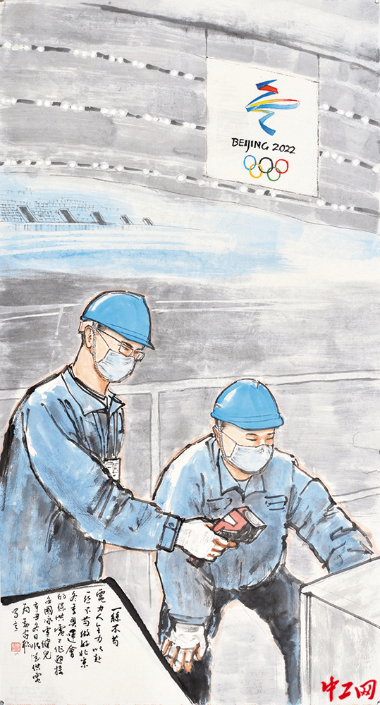 《一丝不苟保供电》(国画,尺寸96cm×178cm),作者黄家联,“冰雪情·冬奥梦”全国职工冰雪主题绘画活动入围奖作品