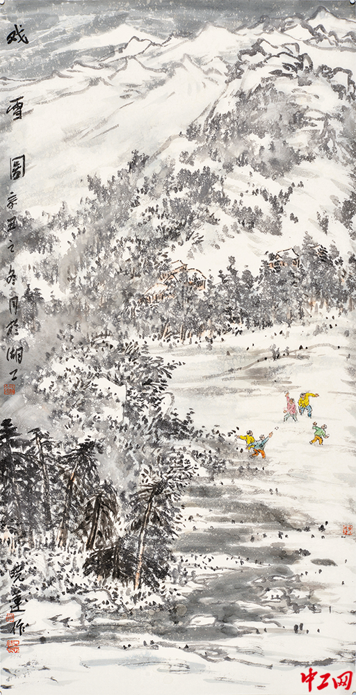 《戏雪图》(国画,尺寸68cm×136cm),作者洪晓莲,“冰雪情·冬奥梦”全国职工冰雪主题绘画活动优秀奖作品