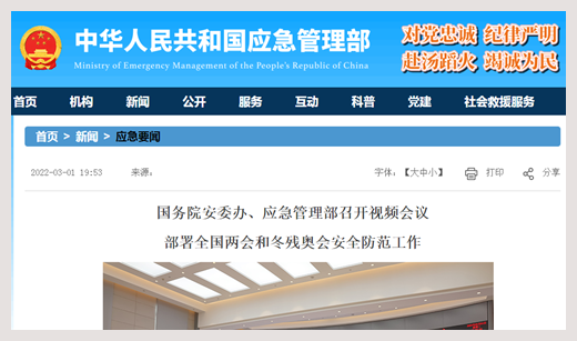 中工网讯 据应急管理部网站消息,3月1日,国务院安委会办公室、应急管理部召开全国两会和冬残奥会安全防范工作视频会议。