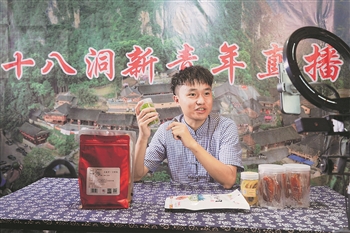 图②:施康正在通过直播为家乡的特产“带货”。工人日报-中工网通讯员 杨子龙 摄