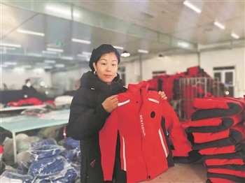 图④:王文娟展示其所在企业生产的校服。工人日报-中工网记者 马学礼 摄