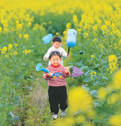 2月26日,湖南省永州市道县祥霖铺镇两河口村,小朋友在油菜花田里玩耍。何红福摄(人民视觉)