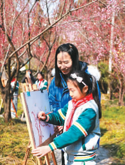 2月23日,江苏省宿迁市泗洪县洪桥学校开展“好作业——描绘春天”课外实践活动,学生在老师的指导下画梅花。刘成龙摄(人民视觉)
