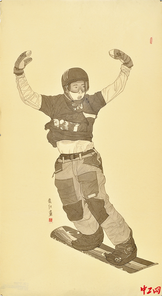 《夺冠时刻》(国画,96cm×174cm),作者付爱红,“冰雪情·冬奥梦”全国职工冰雪主题绘画活动优秀奖作品
