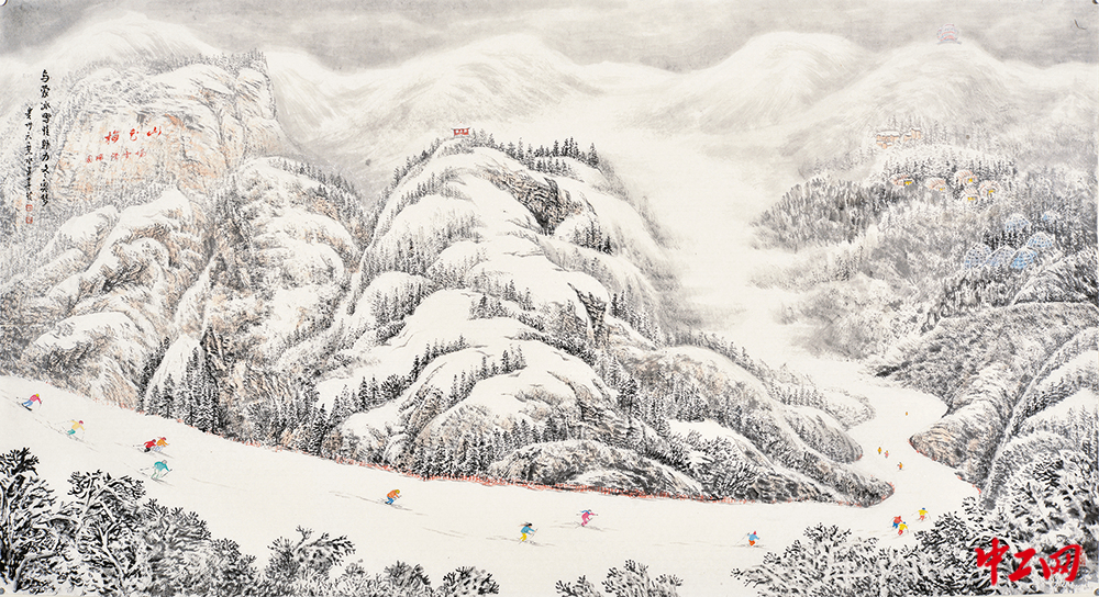 《乌蒙冰雪情 助力冬奥梦》(国画,180cm×97cm),作者吴喜玲,“冰雪情·冬奥梦”全国职工冰雪主题绘画活动优秀奖作品