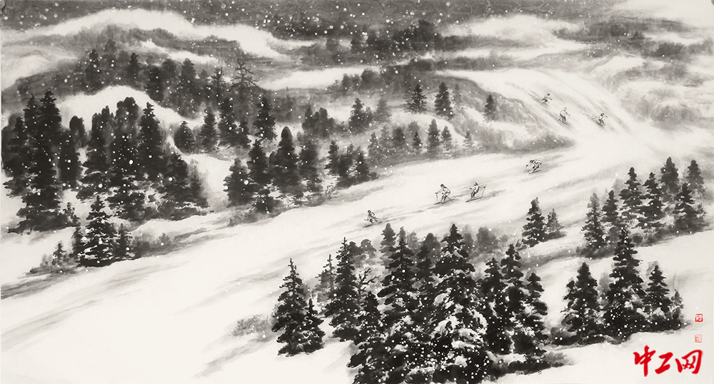 《兴安飞雪》(国画,180cm×96cm),作者李玉成,“冰雪情·冬奥梦”全国职工冰雪主题绘画活动优秀奖作品