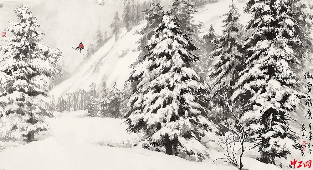 《傲雪飞鹰》(国画,180cm×97cm),作者宋丽香,“冰雪情·冬奥梦”全国职工冰雪主题绘画活动优秀奖作品