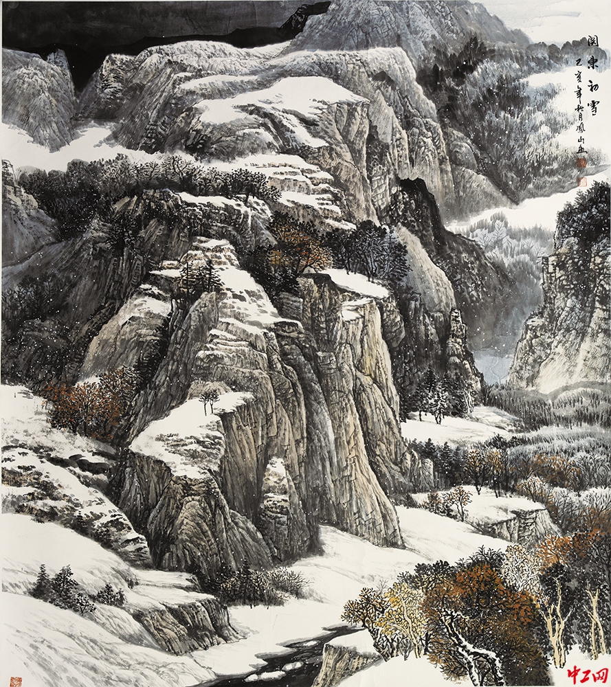 《关东初雪》(国画,98cm×180cm),作者高凤山,“冰雪情·冬奥梦”全国职工冰雪主题绘画活动优秀奖作品