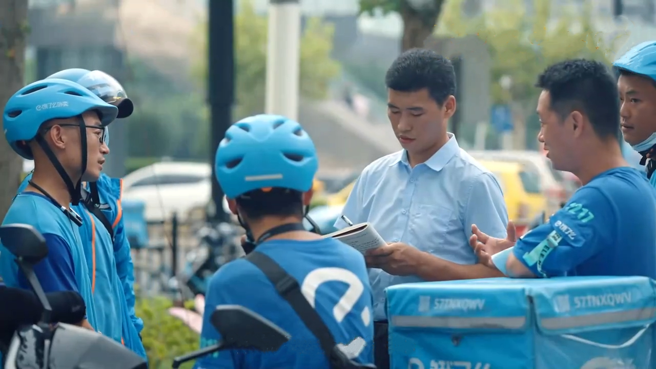 上海的街头,一群外卖配送员正围在一起,“吐槽”他们工作中遇到的各种问题。