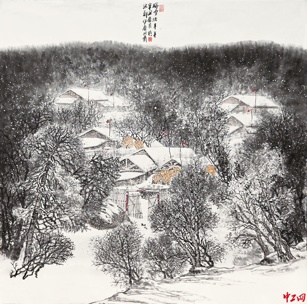 《瑞雪兆丰年》(国画,110cm×110cm),作者胡丹青,“冰雪情·冬奥梦”全国职工冰雪主题绘画活动优秀奖作品