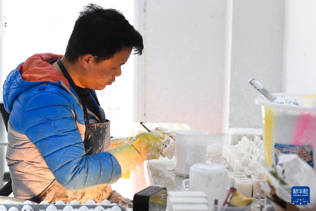 3月1日,在惠水县幸福移民社区的唐人坊产教融合基地,工人在制模“唐娃娃”零部件。