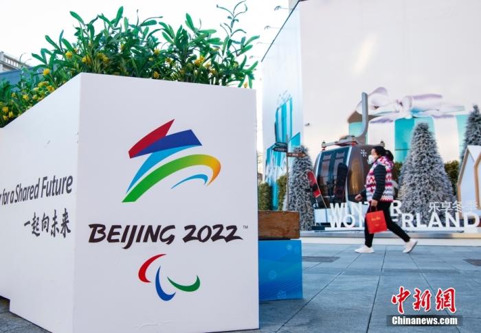 3月1日,距离北京2022年冬残奥会开幕还有3天,市民经过北京市王府井步行街上布置的北京冬残奥会会徽标志。 中新社记者 侯宇 摄