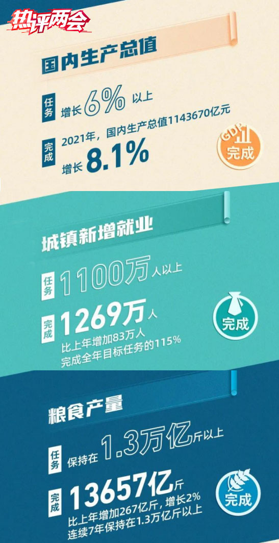 国内生产总值预期目标增长6%以上,实际增长8.1%;城镇新增就业预期目标1100万人以上,实际新增就业1269万人;粮食产量预期目标保持在1.3万亿斤以上,实际增长2%,达到13657亿斤……过去一年,多项指标均实现超额完成,实属不易,既彰显了党中央团结带领全党全国各族人民攻坚克难的能力,也坚定了我们在新的一年取得新成就的信心。