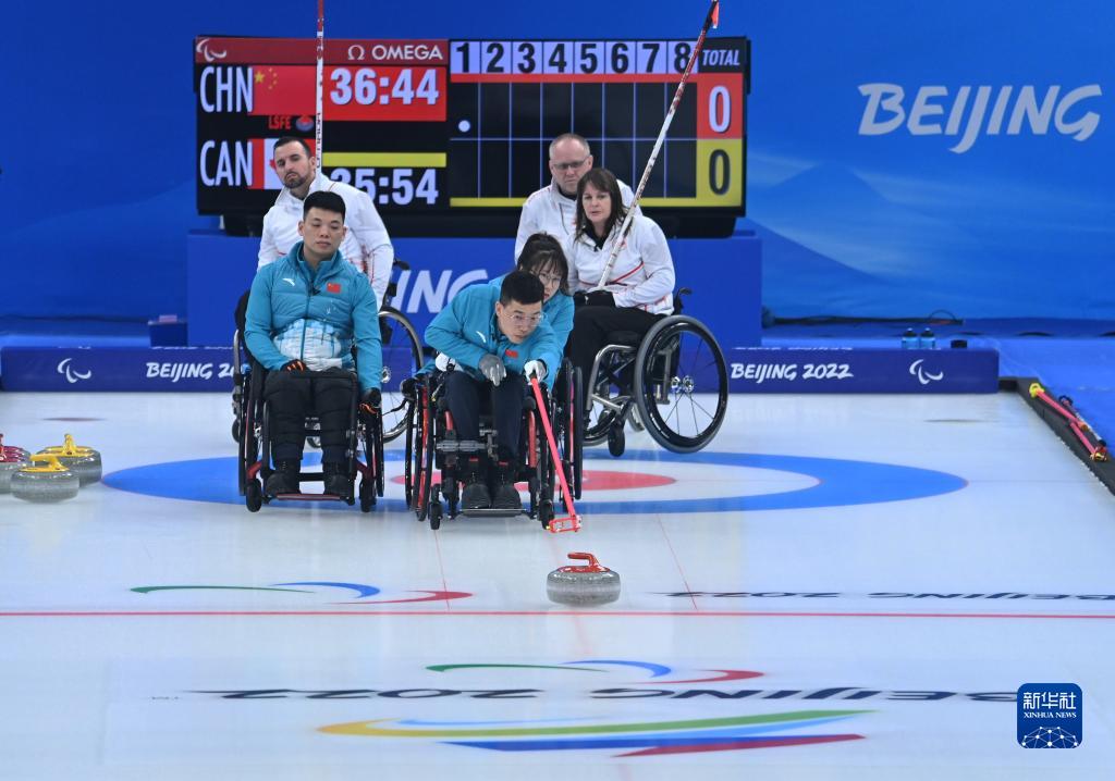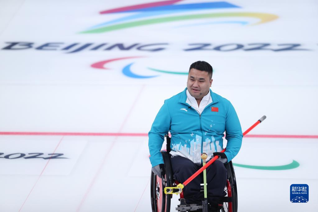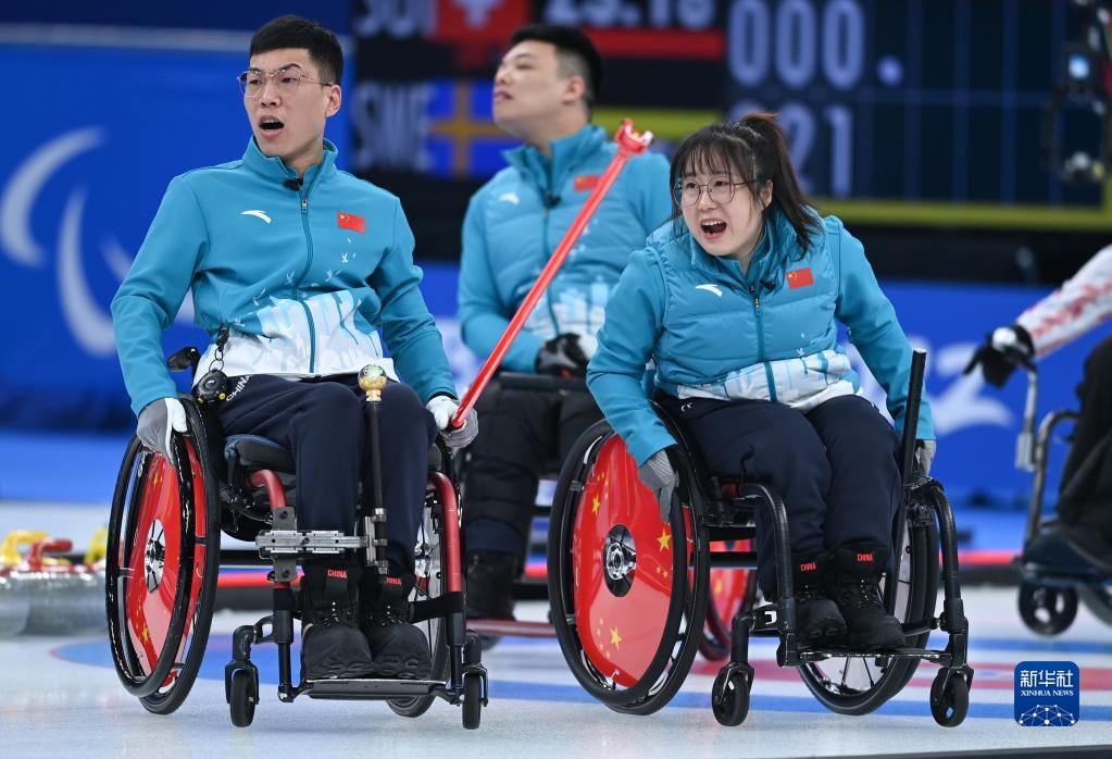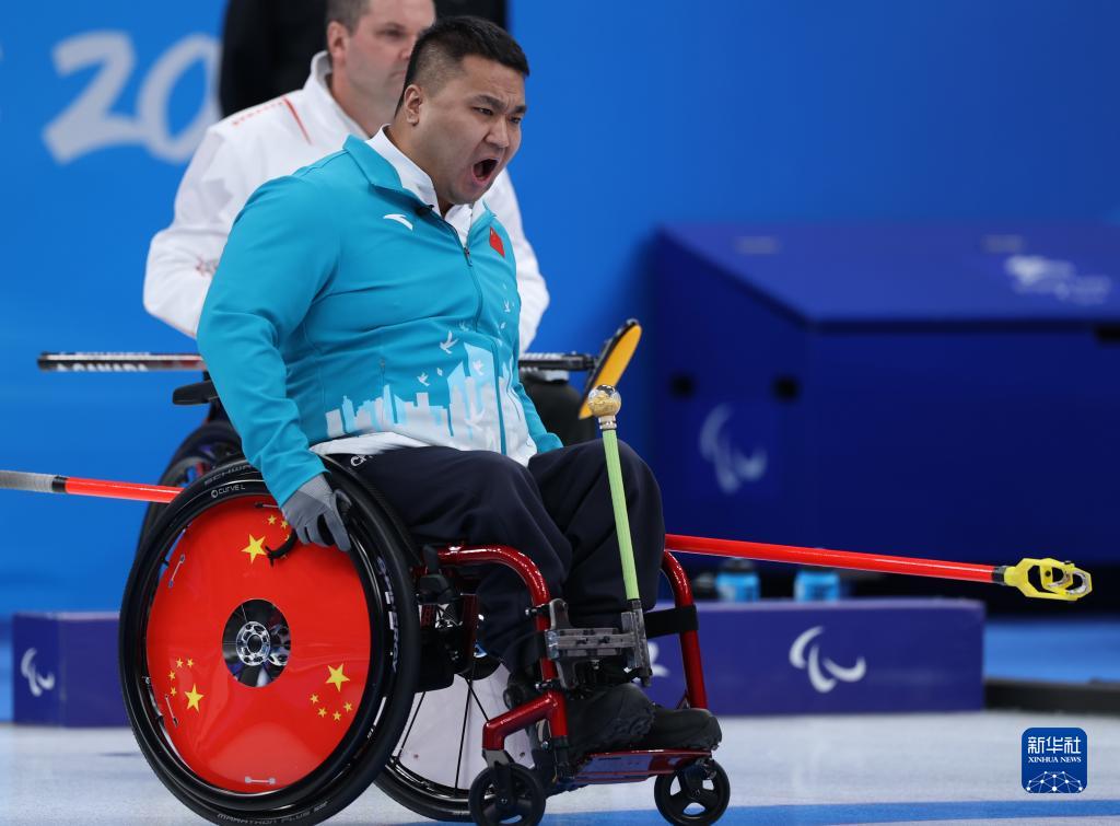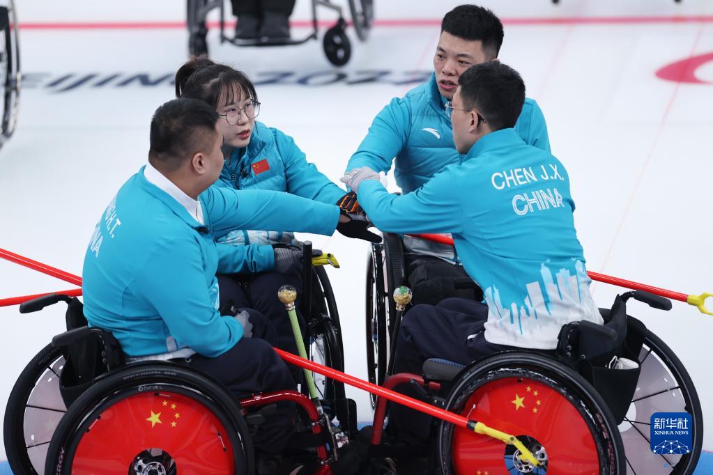 3月5日,中国队选手闫卓(右)、陈建新(左)在比赛中庆祝得分。当日,在北京国家游泳中心“冰立方”举行的北京2022年冬残奥会轮椅冰壶循环赛中,中国队以3比7负于加拿大队。新华社记者 张博文 摄