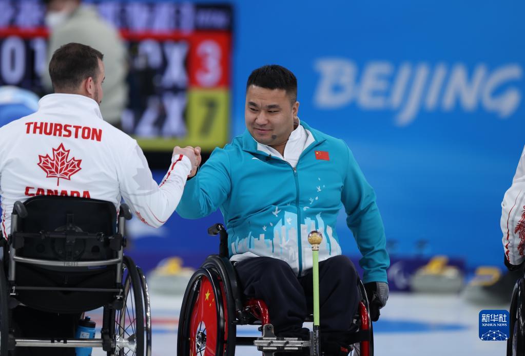 3月5日,中国选手王海涛(右)赛后与加拿大队选手乔恩·瑟斯顿碰拳致意。新华社记者杜潇逸摄