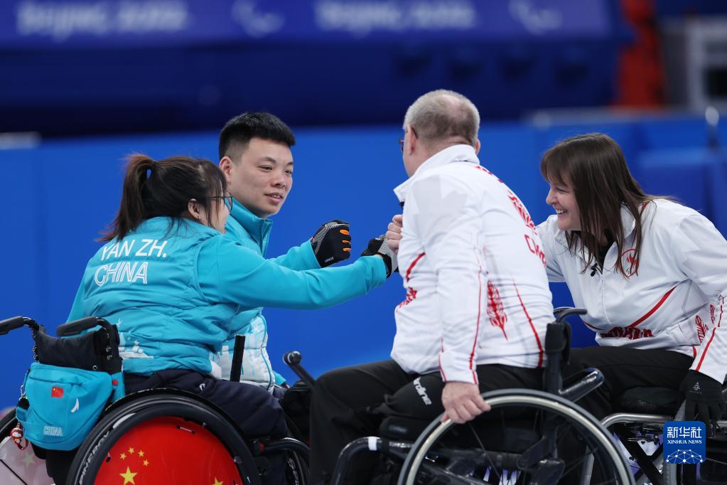 3月5日,中国队选手闫卓(左一)、张明亮(左二)与加拿大队选手丹尼斯·蒂森、艾娜·福里斯特(右一)在比赛后击拳致意。新华社记者 许雅楠 摄