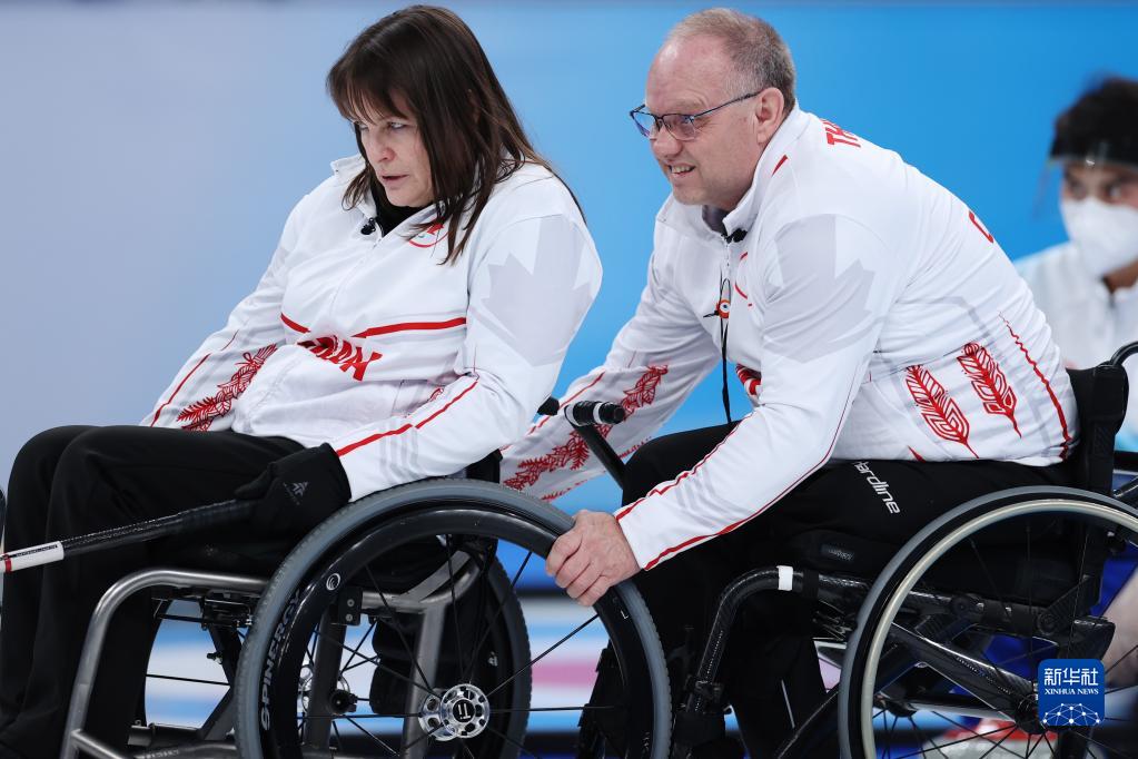 3月5日,加拿大队选手丹尼斯·蒂森(右)辅助队友艾娜·福里斯特掷壶。新华社记者 许雅楠 摄