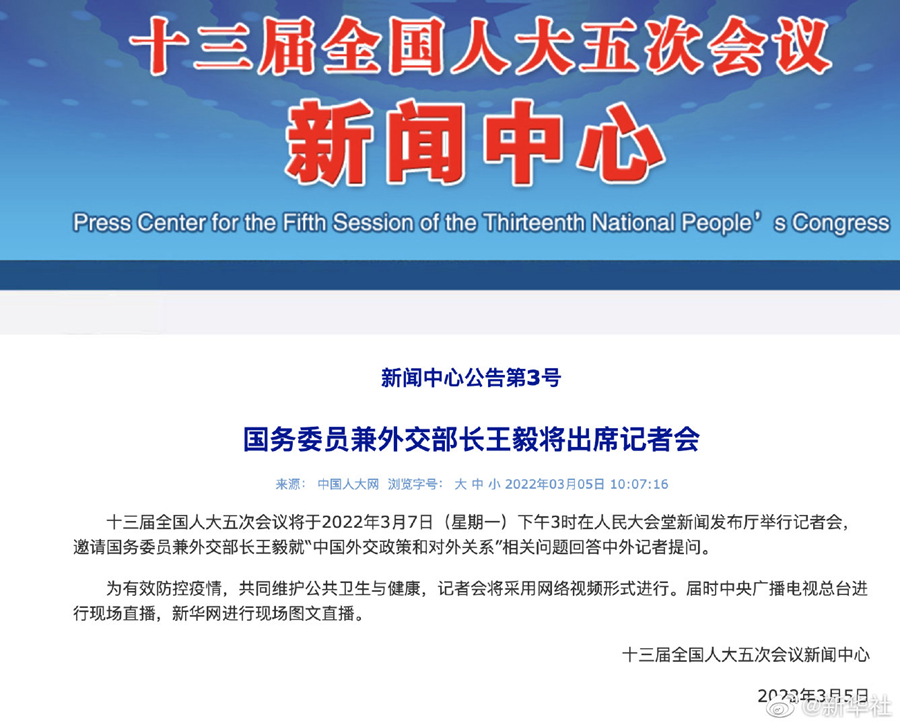 十三届全国人大五次会议将于3月7日(星期一)下午3时在人民大会堂新闻发布厅举行记者会,邀请国务委员兼外交部长王毅就“中国外交政策和对外关系”相关问题回答中外记者提问。