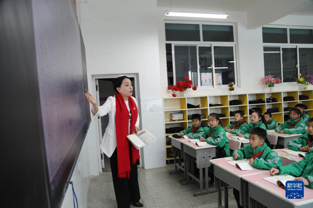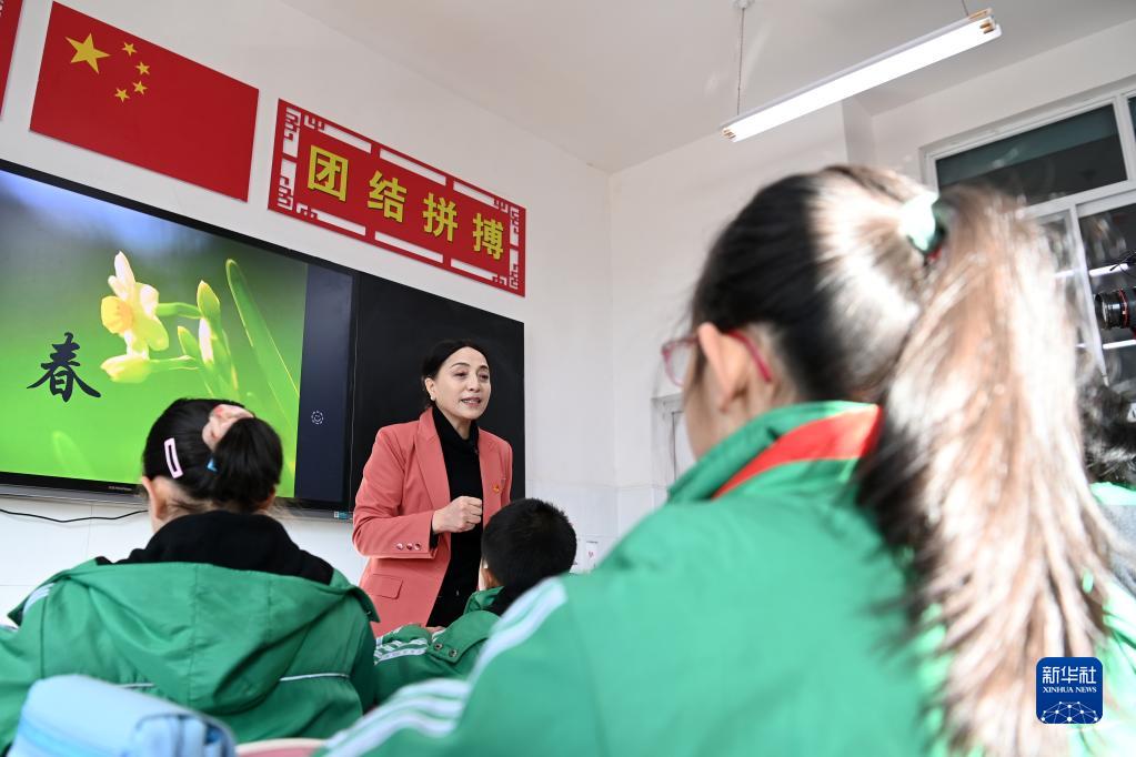 董彩云在甘肃临夏积石山保安族东乡族撒拉族自治县吹麻滩小学给孩子们上语文课(2021年2月28日摄)。