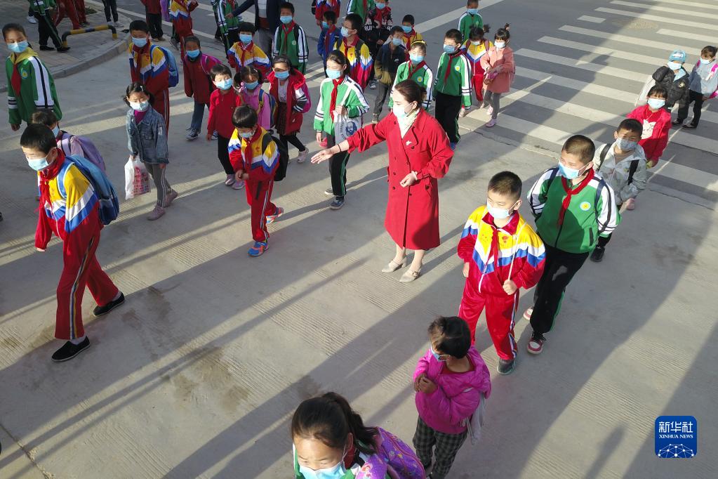 在吹麻滩小学校门外,董彩云(中)引导学生有序进入校园测量体温(2020年5月12日摄)。