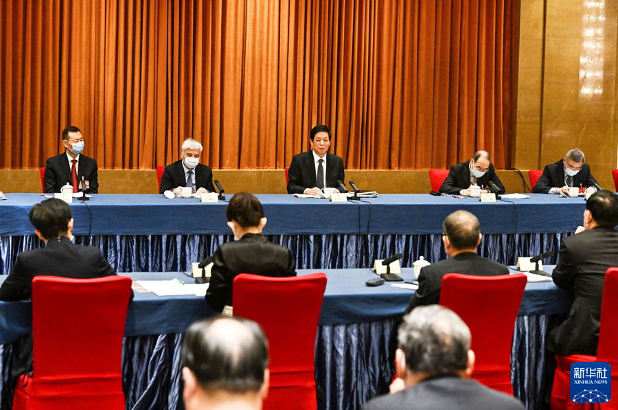 3月6日,中共中央政治局常委、全国政协主席汪洋看望出席全国政协十三届五次会议的民建、工商联界委员并参加讨论。新华社记者 李响 摄