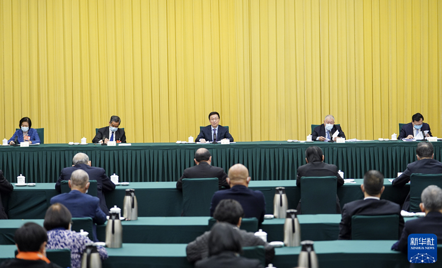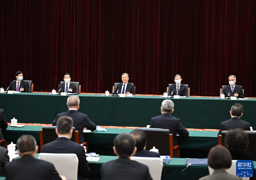 3月6日,中共中央政治局常委、国务院副总理韩正看望出席全国政协十三届五次会议的港澳地区全国政协委员并参加讨论。新华社记者 殷博古 摄