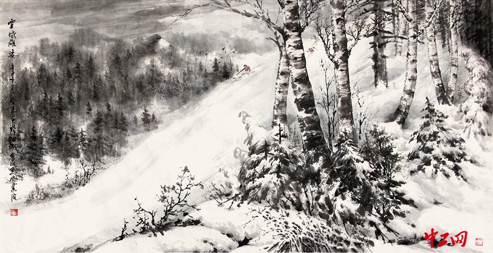 《雪域雄姿》(国画,180cm×97cm),作者于会臣,“冰雪情·冬奥梦”全国职工冰雪主题绘画活动优秀奖作品