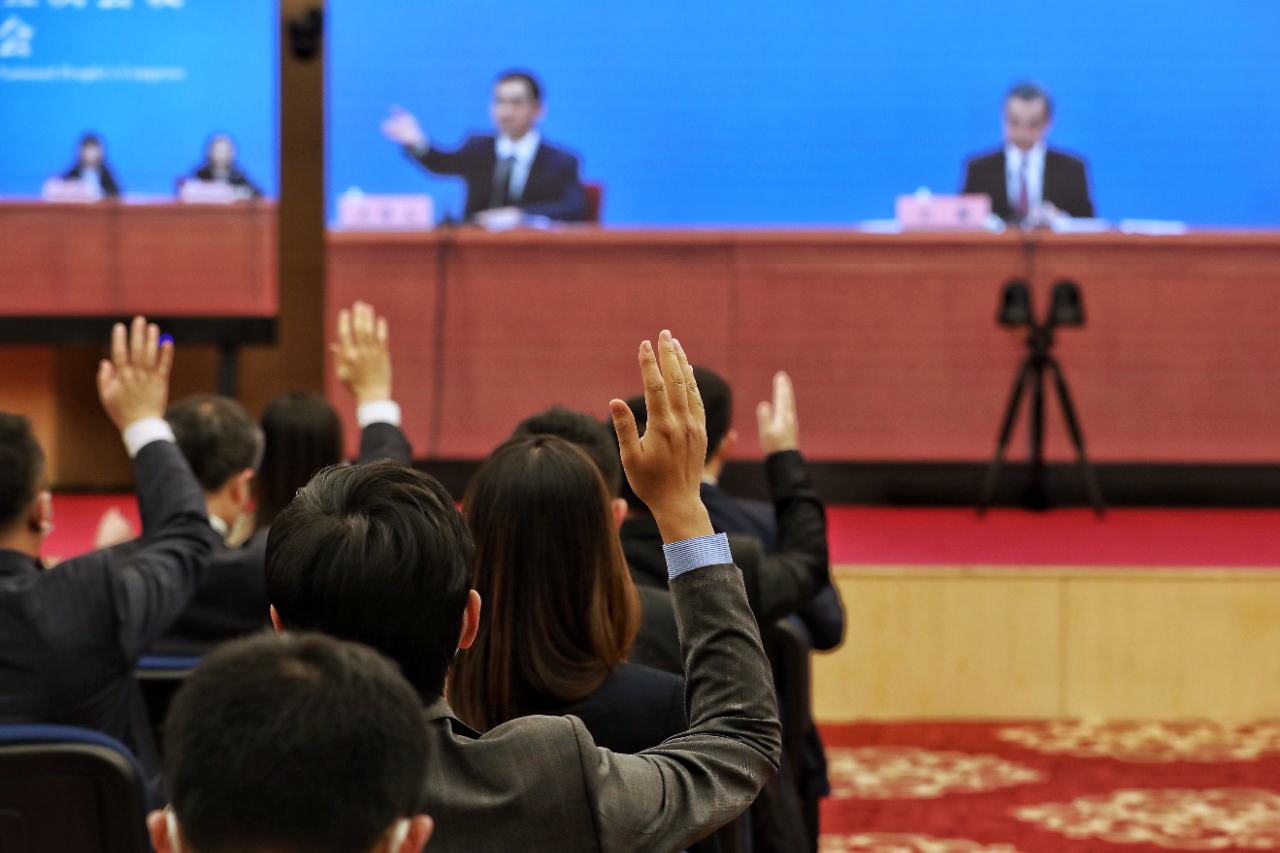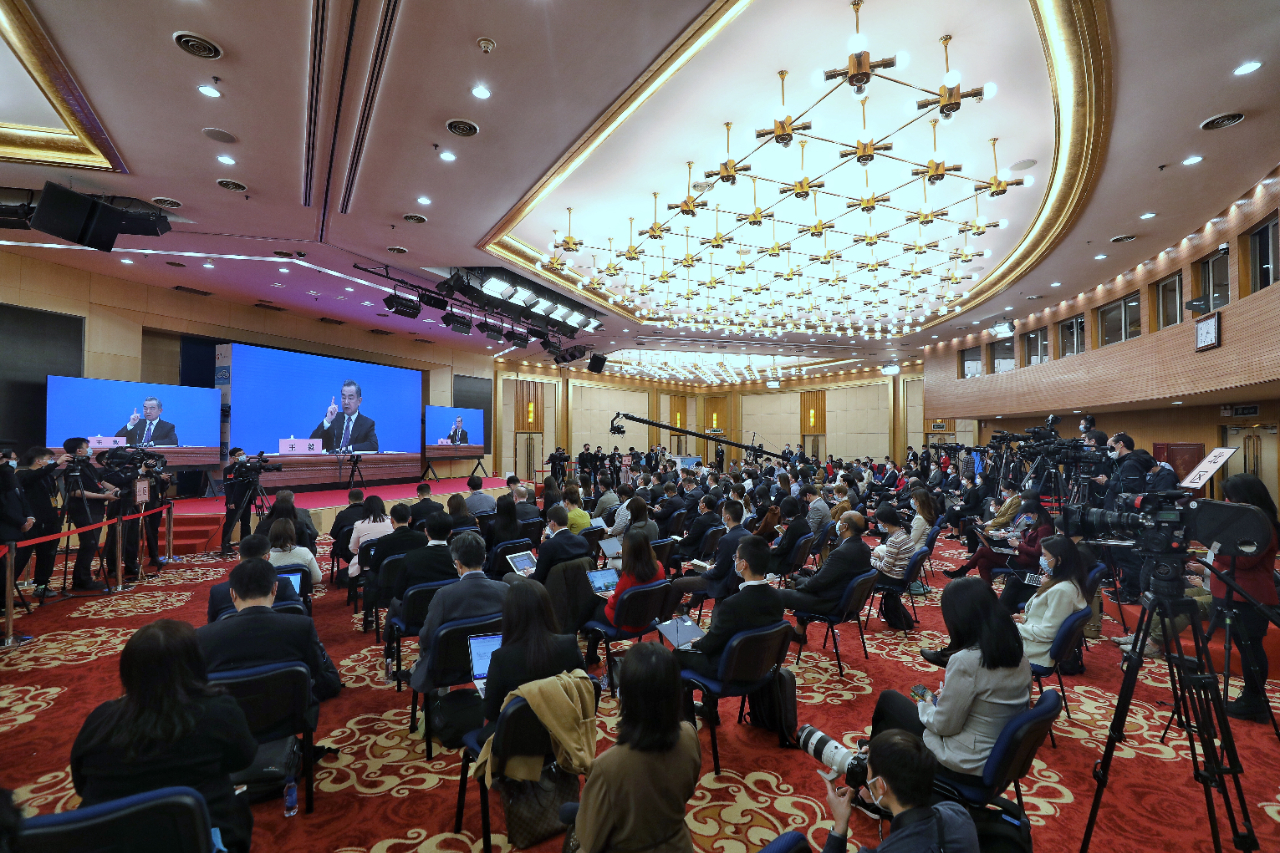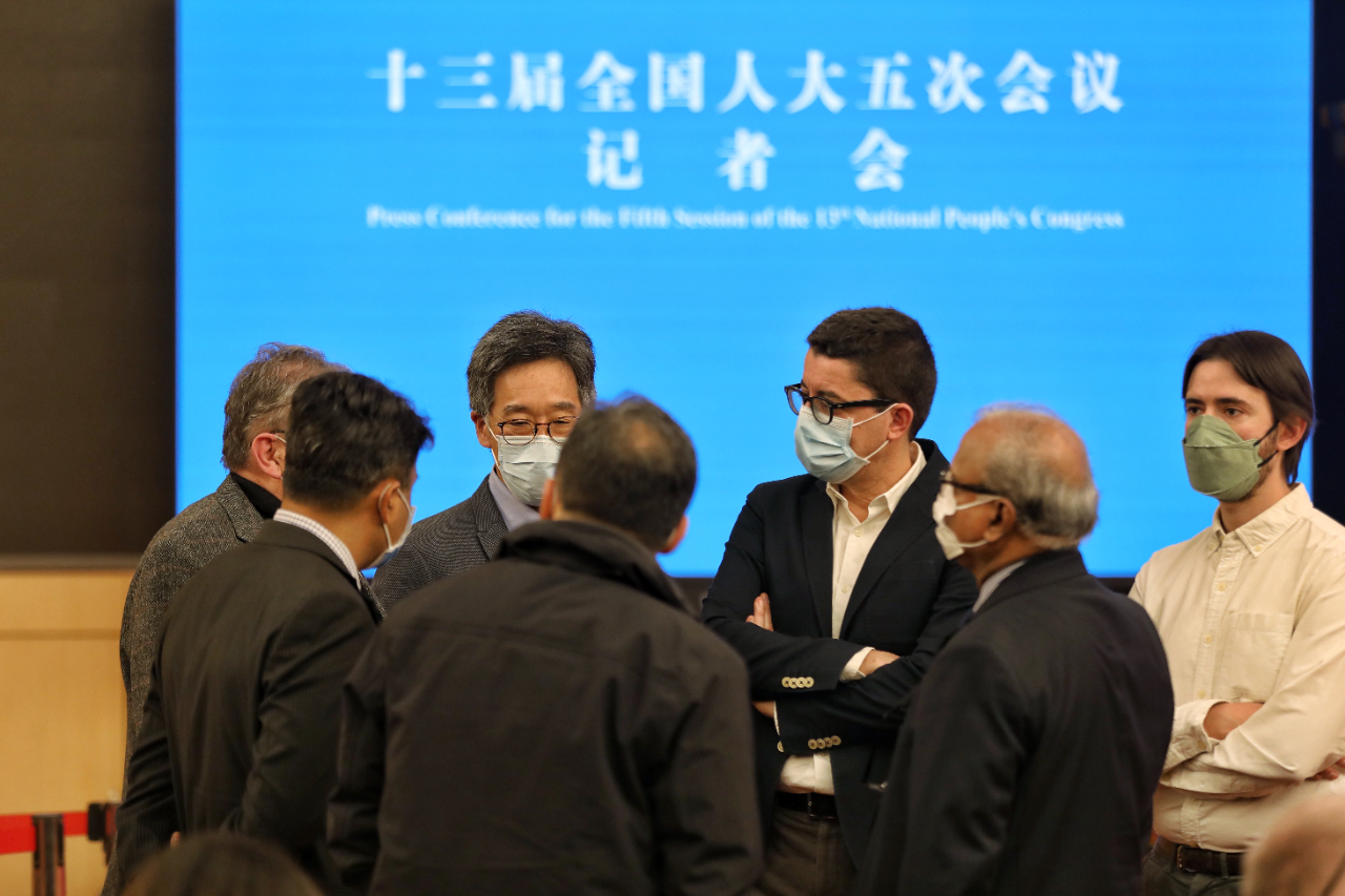 3月7日下午3时,在人民大会堂新闻发布厅举行的十三届全国人大五次会议记者会上,国务委员兼外交部长王毅就“中国外交政策和对外关系”相关问题答中外记者问。图为记者在会前交流。