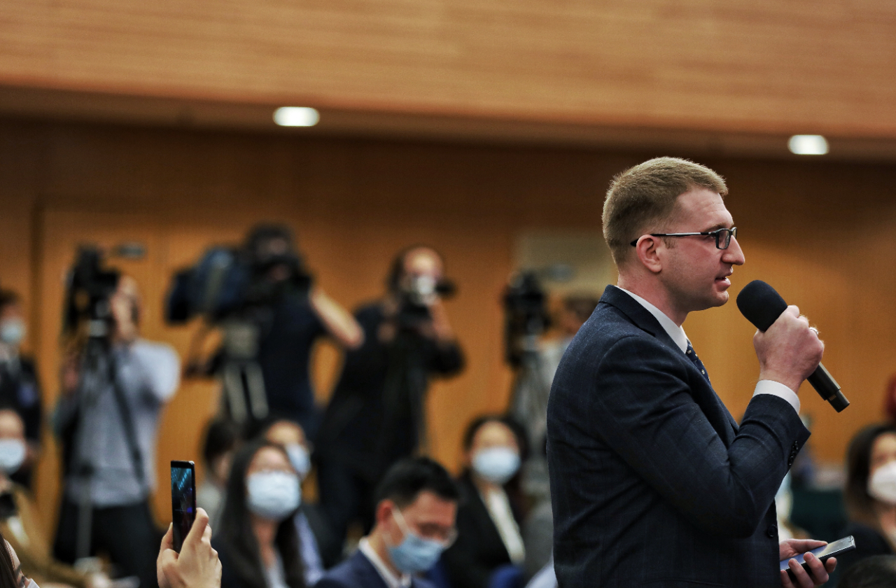 3月7日下午3时,在人民大会堂新闻发布厅举行的十三届全国人大五次会议记者会上,国务委员兼外交部长王毅就“中国外交政策和对外关系”相关问题答中外记者问。图为俄罗斯记者提问。