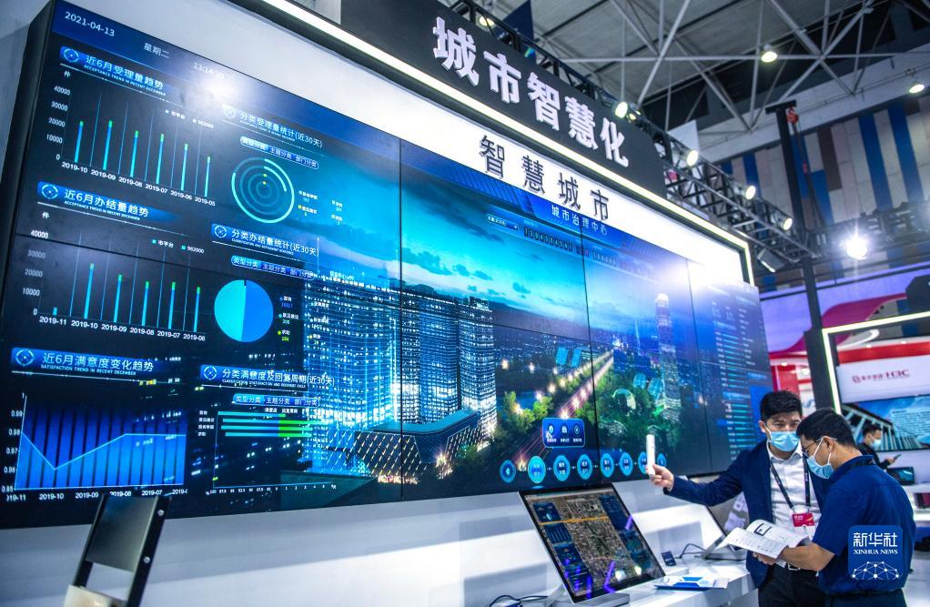 2021年5月26日,在贵阳举办的2021中国国际大数据产业博览会上,参会者在了解智慧城市治理中心。