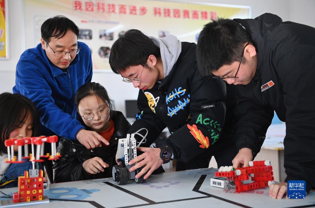 2021年11月22日,陕西省安康市白河高级中学机器人社团的学生在制作机器人。
